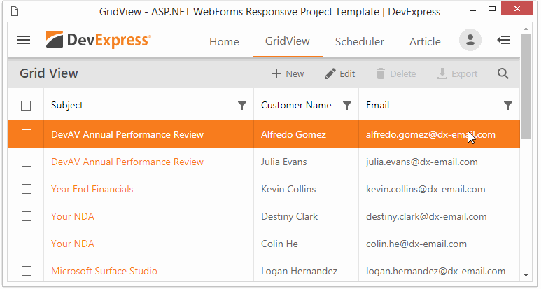 The Responsive Web Application template includes several adaptive web pages based on DevExpress ASP.NET AJAX controls or MVC extensions. You can use the layout elements from this template to create an adaptive layout in your application.